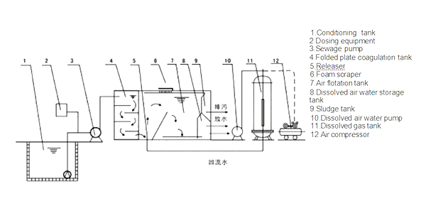 Su núcleo técnico radica en la regulación fina de la interfaz trifásica de gas-líquido-líquido. El tanque de aire disuelto produce agua de aire disuelto, que se libera al agua para tratarse a través de un dispositivo de liberación a una presión reducida. El aire disuelto en el agua se libera del agua para formar microburbujas de 20-40um, que se combinan con materia suspendida en las aguas residuales, lo que hace que la gravedad específica de la materia suspendida sea menos que el peso del agua, y flotan gradualmente a la superficie del agua para formar escoria. Hay un sistema raspador en la superficie del agua para raspar la escoria en la piscina de lodo. El sistema de raspado empuja la escoria al tanque de recolección a una velocidad constante, y el agua tratada ingresa al tanque de agua transparente desde la parte inferior a través del tanque de desbordamiento.